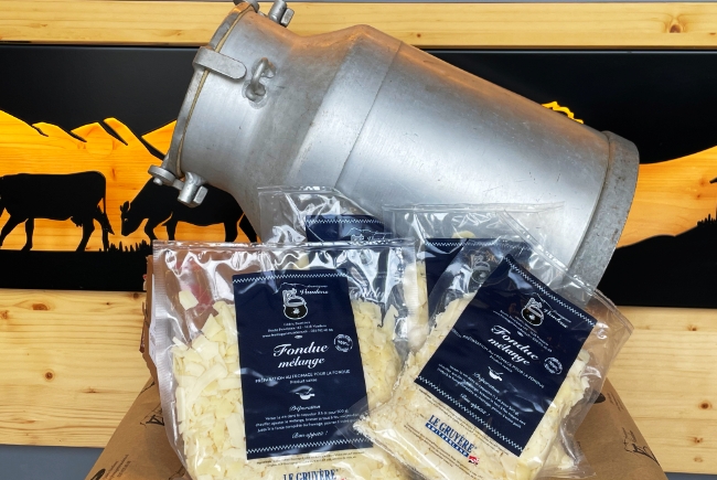 Notre fondue Mélange est composée de Gruyère AOP et de Vacherin AOP